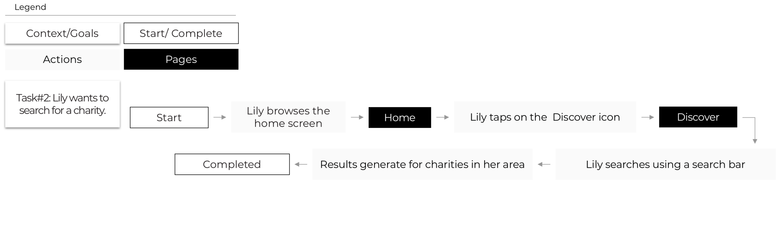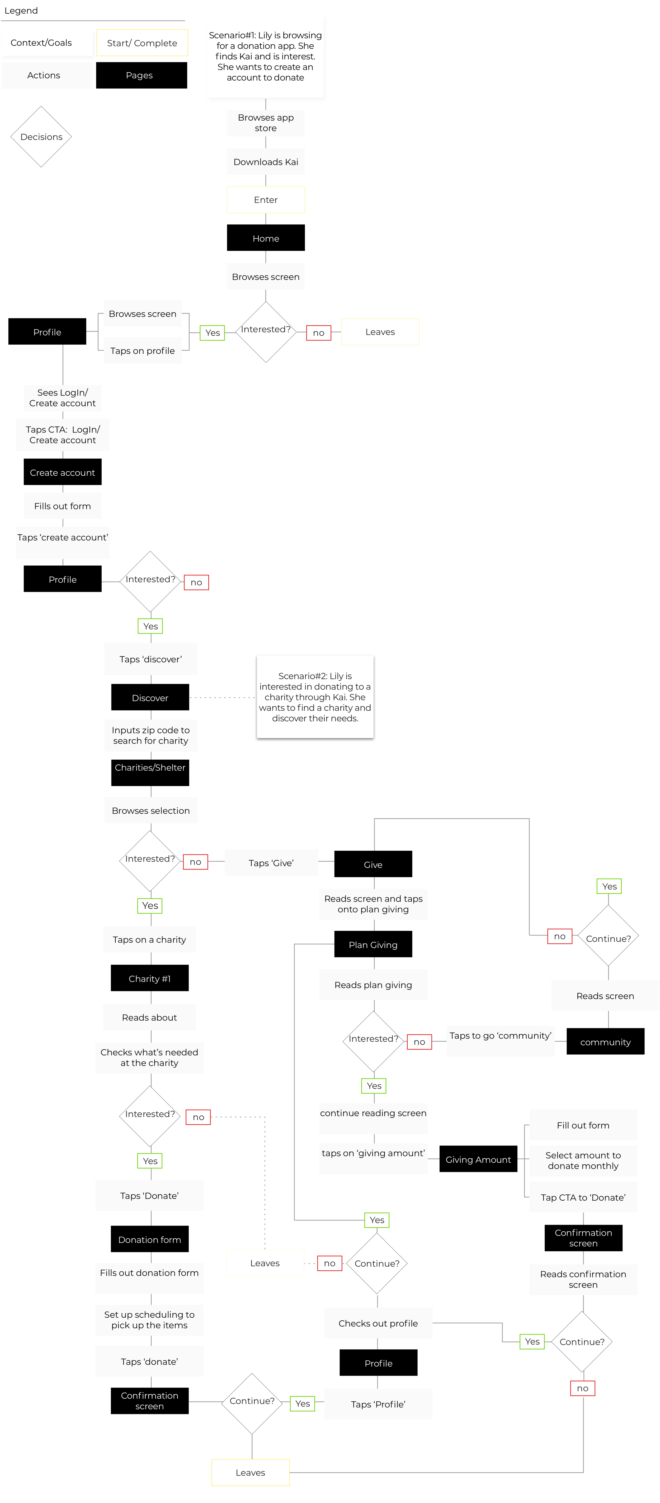 To better understand the User’s interaction with the application. I created a User Flow to gain insight into potential navigational patterns of Users by illustrating decision trees. I created two scenarios for Lily in which I hypothesized her actions and decisions to get to certain screens on Kai’s app.