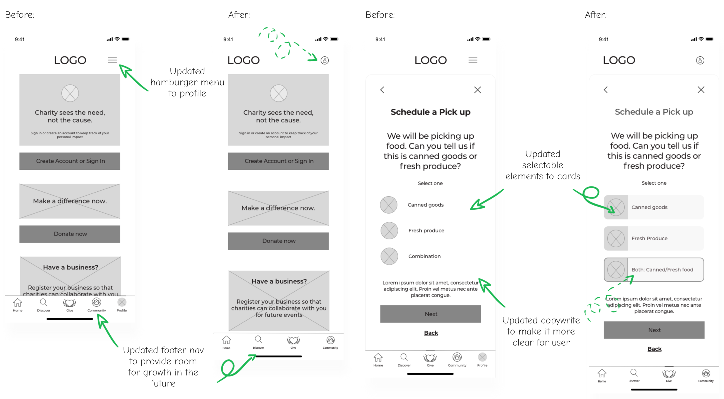 After I rendered the mid-fidelity wireframes, I created a prototype using Invision. This mid-fidelity prototype is a simplified version consisting of home, search, give community screens. As well as screens to complete schedule pick-up donation. I used this prototype to conduct a usability test and I will ask participants to complete the following tasks:
