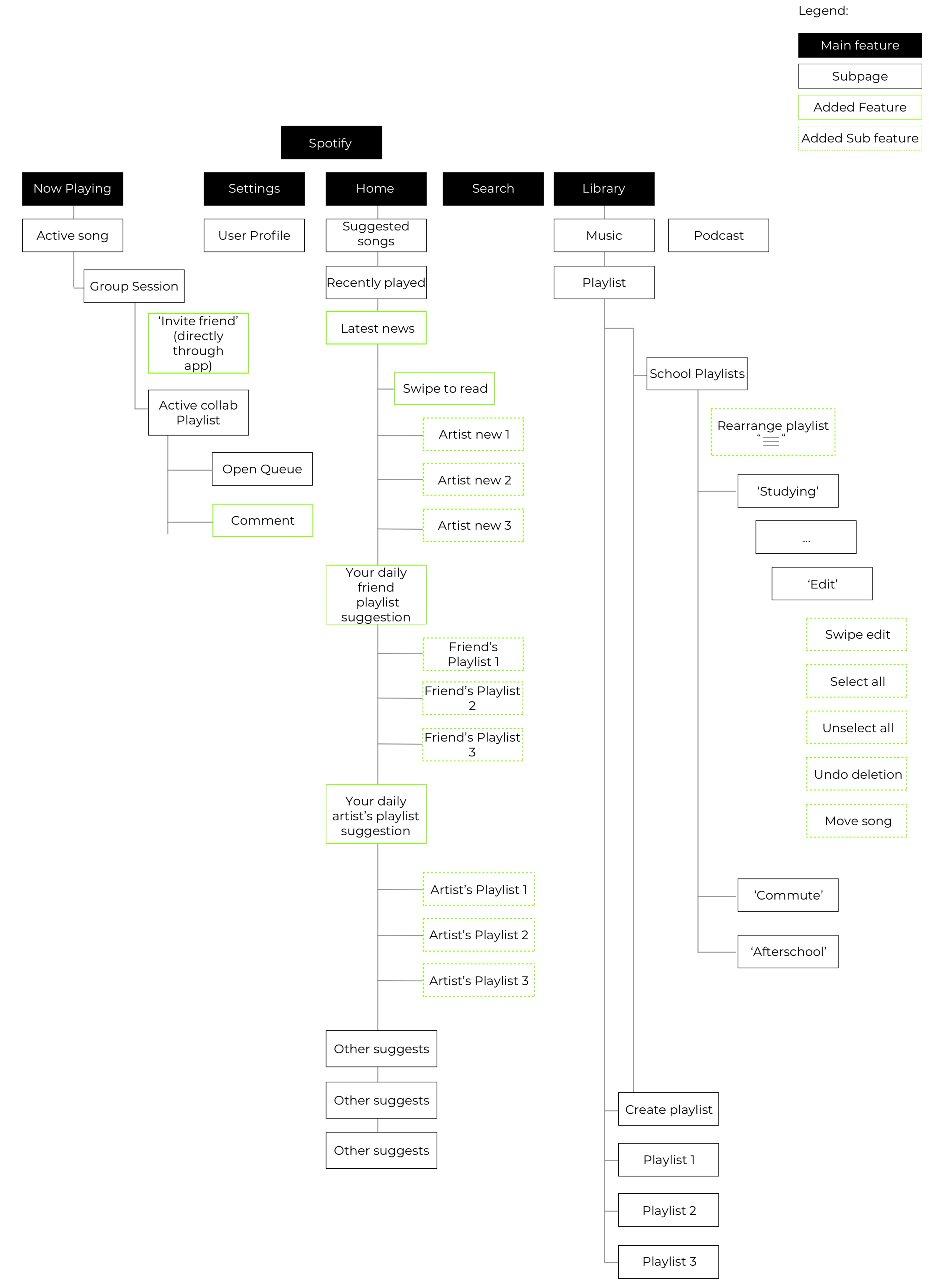With the gathered information from the competitor’s analysis, project goals, road map; I created Spotify’s application map that shows the app’s interconnectivity. I created this so that I could understand and organize how the site would function.