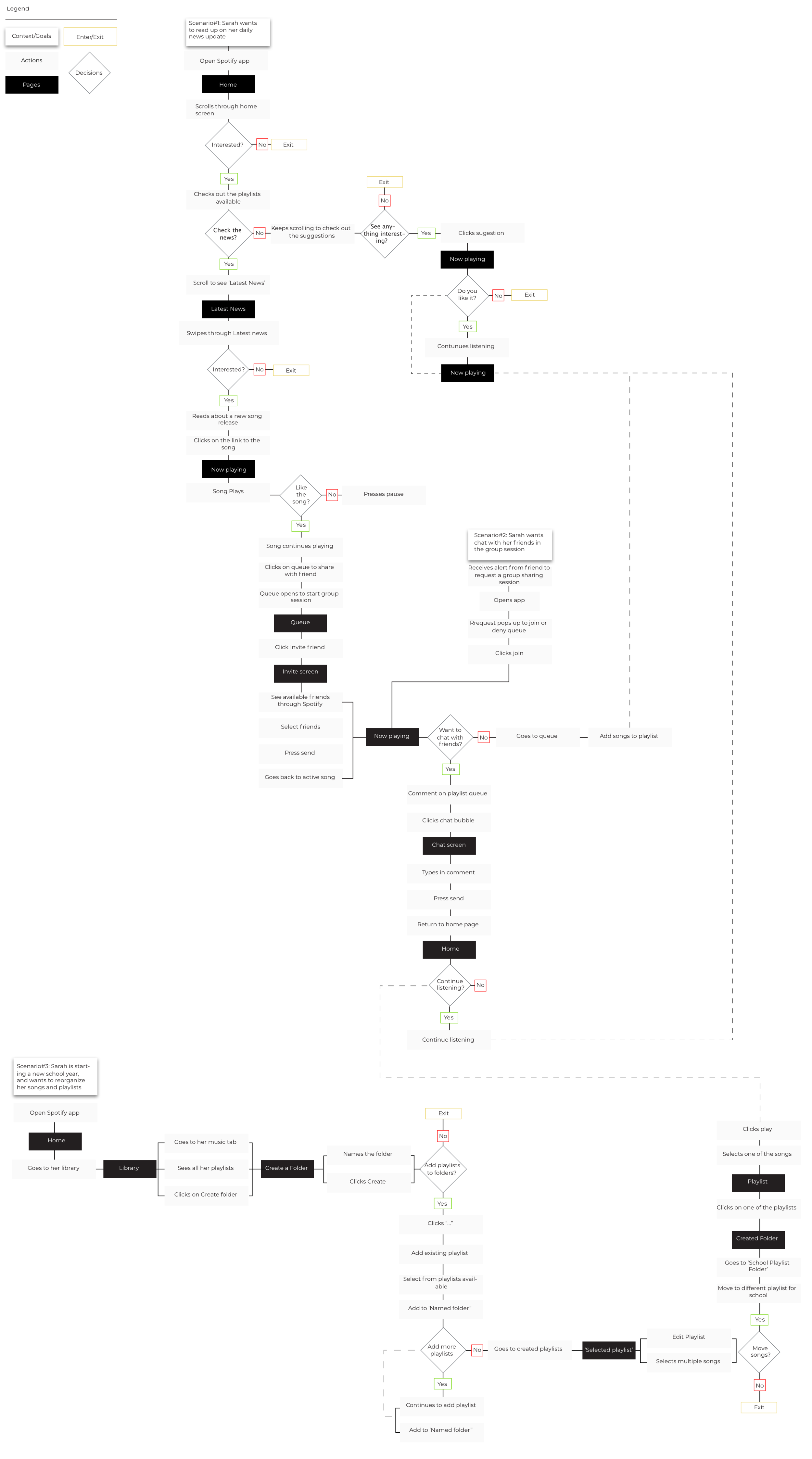 To better understand the User’s interaction with the app. I created a User Flow diagram to gain insight into potential navigational patterns of Users. I showed this by illustrating decision trees. I created two scenarios for Sarah in which I hypothesized her actions and decisions to get to certain screens on Spotify’s app.